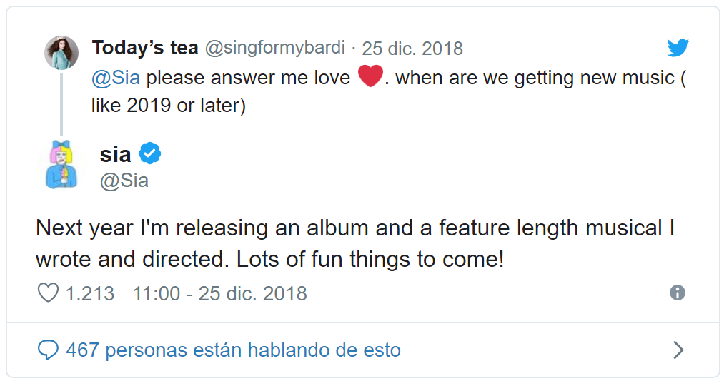 La cantante, compositora, productora y actriz australiana Sia, ha contestado diversas preguntas de sus seguidores de Twitter y ha revelado que tiene programado lanzar el próximo año su nuevo disco de estudio.